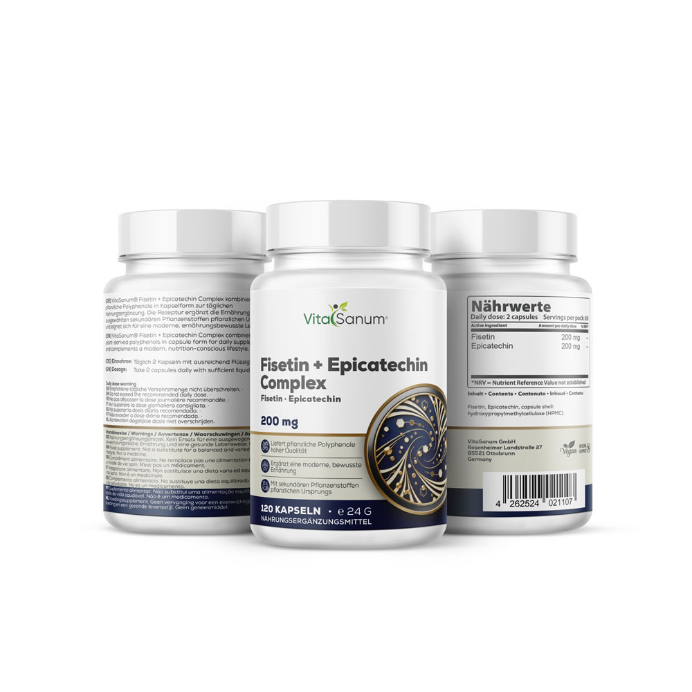 VitaSanum® Fisetin + Epicatechin Complex kombiniert zwei pflanzliche Polyphenole in Kapselform zur täglichen Nahrungsergänzung. Die Rezeptur ergänzt eine ausgewogene Ernährung mit ausgewählten sekundären Pflanzenstoffen pflanzlichen Ursprungs.