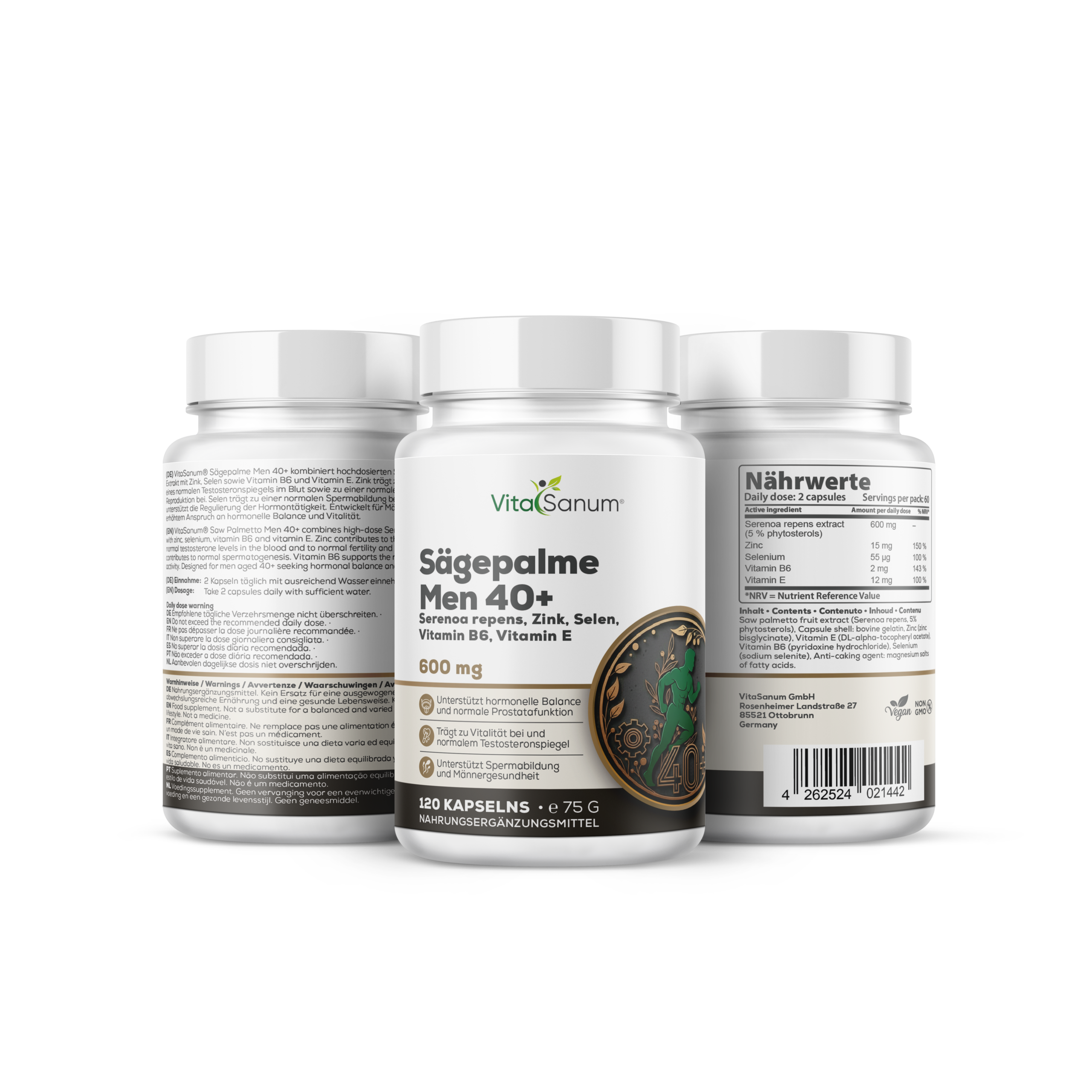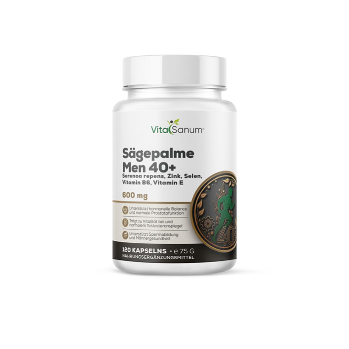 VitaSanum® Sägepalme Men 40+ kombiniert Serenoa repens Extrakt mit Zink, Selen sowie Vitamin B6 und Vitamin E. Zink trägt zur Aufrechterhaltung eines normalen Testosteronspiegels im Blut sowie zu einer normalen Fruchtbarkeit und Reproduktion bei. Selen trägt zu einer normalen Spermabildung bei. Vitamin B6 trägt zur Regulierung der Hormontätigkeit bei. Vitamin E trägt dazu bei, die Zellen vor oxidativem Stress zu schützen.